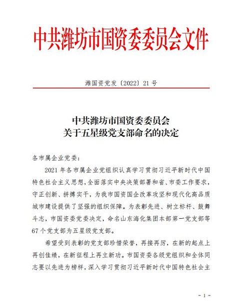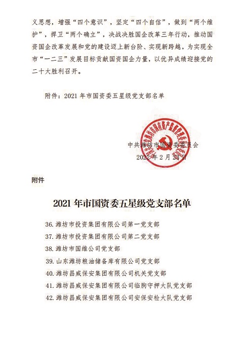 近日,濰坊市國資委黨委印發(fā)《關于五星級黨支部命名的決定》,集團公司一支部、二支部、國維公司黨支部、糧油儲備庫黨支部、昌威集團機關黨支部、臨朐守押大隊黨支部、安保安檢大隊黨支部7個黨支部榜上有名,被國資委黨委表彰命名為2021年度五星級黨支部。