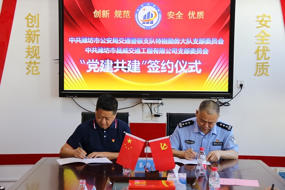 為創(chuàng)新基層黨建工作載體,提高黨建工作水平,經(jīng)友好協(xié)商,5月27日,交通工程有限公司黨支部與濰坊市公安局交通警察支隊(duì)特別勤務(wù)大隊(duì)黨支部舉行黨建共建簽約儀式。簽約儀式由黨支部組織委員周國兵同志主持,黨支部副書記劉新強(qiáng),黨支部保密委員劉玉增,濰坊市公安局交通警察支隊(duì)特別勤務(wù)大隊(duì)黨支部書記張亮、組織委員尹希寶、宣傳委員霍連營等參加了簽約儀式。