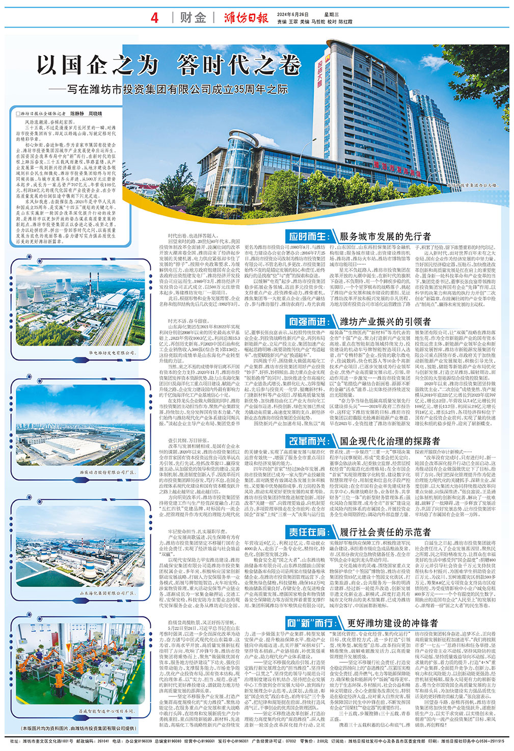 東風(fēng)知我意,擊鼓催征急。2024年是中華人民共和國(guó)成立75周年,是實(shí)施“十四五”規(guī)劃的關(guān)鍵之年,是山東實(shí)施新一輪國(guó)企改革深化提升行動(dòng)的攻堅(jiān)期,是濰坊市以更加開放的姿態(tài)謀求高質(zhì)量發(fā)展的新起點(diǎn),濰坊市投資集團(tuán)正以?shī)^進(jìn)之姿、攻堅(jiān)之勇,全力以赴拼經(jīng)濟(jì),拼出一份回答時(shí)代之問、以高質(zhì)量發(fā)展為底色的亮麗答卷,奮力譜寫實(shí)力強(qiáng)品質(zhì)優(yōu)生活美的更好濰坊新篇章。