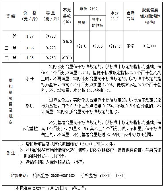 為切實做好地方儲備糧輪換工作,保護種糧農(nóng)民利益,公司自2023年6月13日6時起至輪換任務(wù)完成止公開掛牌收購2023年產(chǎn)新小麥,收購價格及質(zhì)量標(biāo)準(zhǔn)如下: