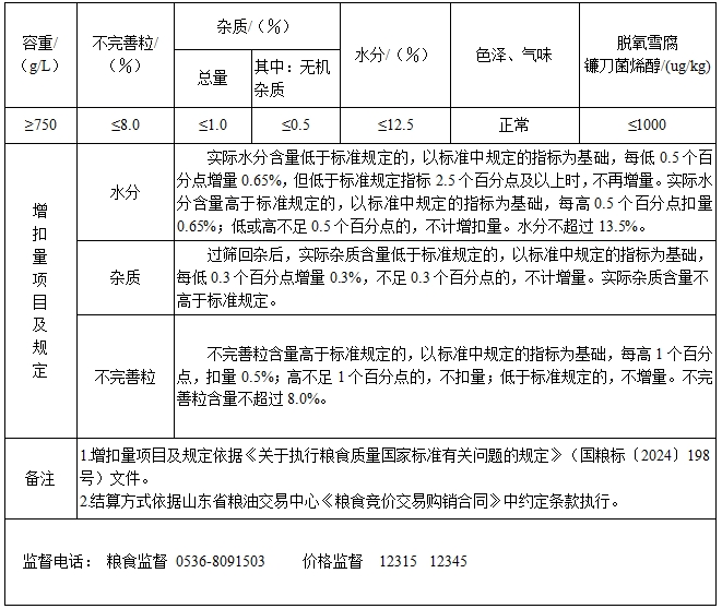 為切實做好地方儲備糧輪換工作,公司自6月1日起收購2025年山東產(chǎn)非雨后小麥,收購價格按山東省糧油交易中心《糧食競價交易購銷合同》約定價格執(zhí)行,收購質(zhì)量標(biāo)準(zhǔn)如下: