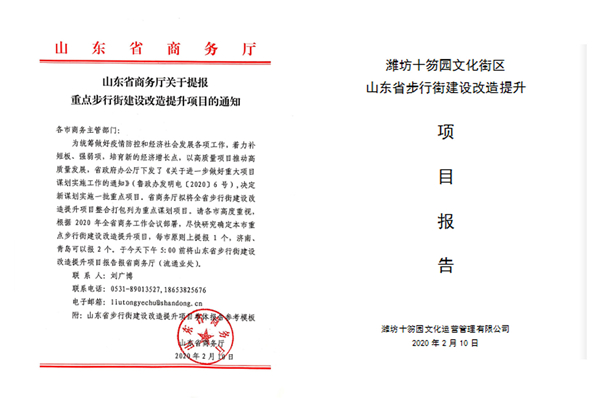 步行街改造提升和繁榮發(fā)展夜經(jīng)濟等工作,是中共中央、國務院《關于完善促進消費體制機制進一步激發(fā)居民消費潛力的若干意見》和2018年中央經(jīng)濟工作會議、2019年《政府工作報告》、國務院辦公廳《關于加快發(fā)展流通促進商業(yè)消費的意見》以及山東省政府《關于加快推進夜間旅游發(fā)展的是會意見》等部署的重要任務。2020年2月10日起,我公司已在山東省商務廳、濰坊市商務局等部門指導下開展了省級步行街創(chuàng)建申報工作。