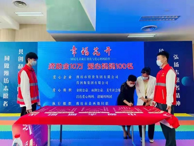 9月24日上午,濰坊市巾幗志愿陽(yáng)光站啟用暨巾幗志愿幫扶項(xiàng)目現(xiàn)場(chǎng)發(fā)布招募會(huì)舉行。市投資集團(tuán)出席“愛心聯(lián)簽”儀式并出資5萬(wàn)元認(rèn)領(lǐng)了“幸福花開——困境兒童成長(zhǎng)幫扶與愛心媽媽陪伴”項(xiàng)目,將對(duì)困境兒童進(jìn)行資助,組織集團(tuán)公司志愿者擔(dān)任“愛心媽媽”,開展“一助一”“一助多”“多助一”等形式的幫扶活動(dòng),在提供物質(zhì)資助的同時(shí),重點(diǎn)以心理?yè)嵛亢途耜P(guān)愛等方式開展關(guān)愛幫扶。
